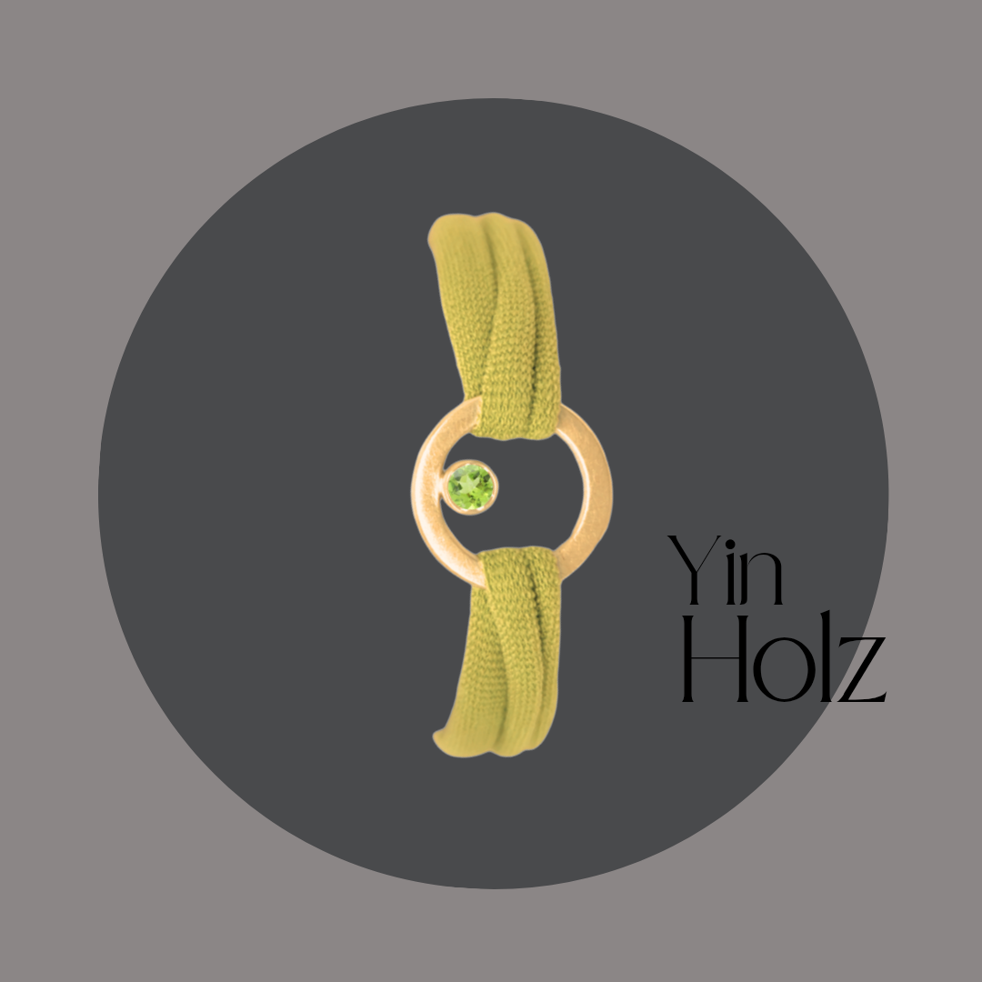 Das Armband besteht aus einem goldplattiertem Silberelement mit Peridot und einem elastischen Band.