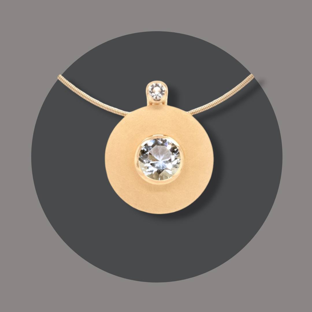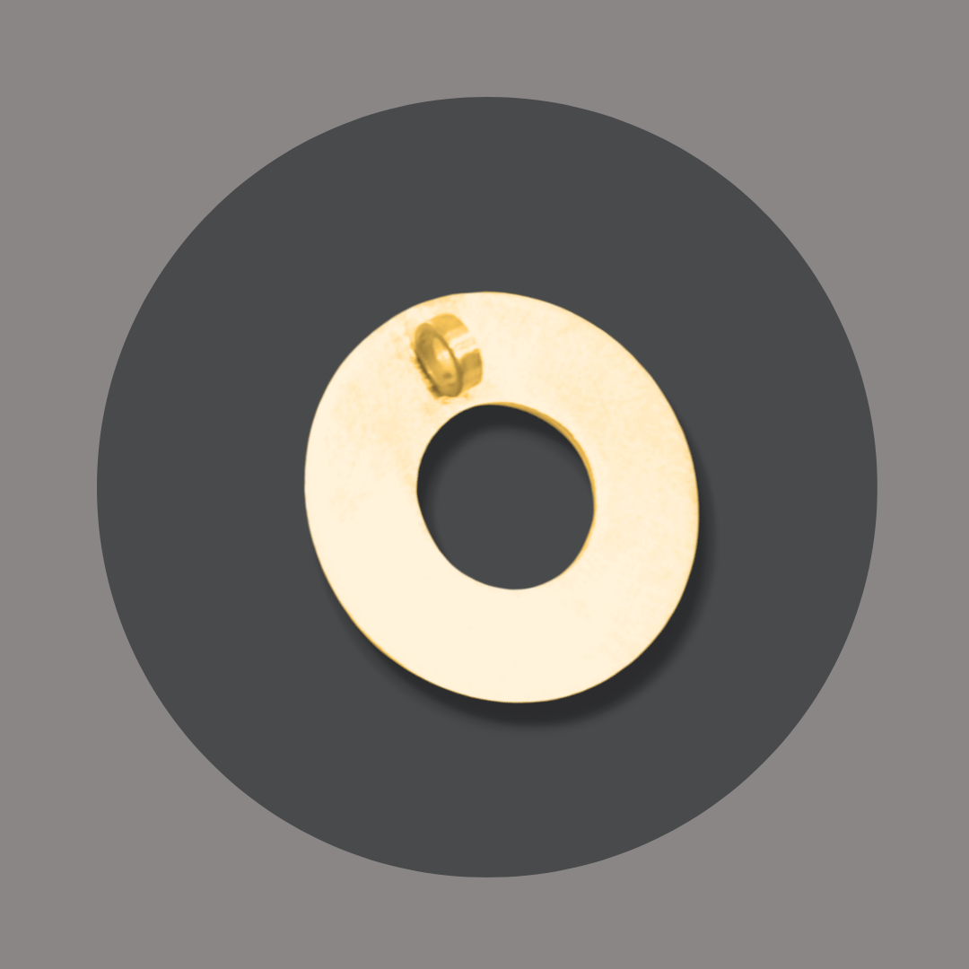 Dafür wird die Scheibe aus goldplattiertem Silber auf den Grundring gesteckt und durch den Halsreif (oder Kette) gesichert.